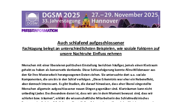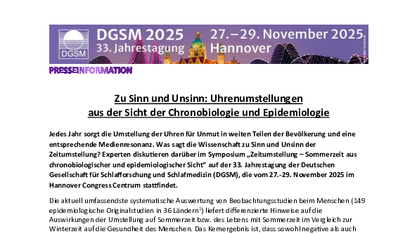 Freuen Sie sich baldmöglichst auf erste Einblicke in die Themen der 34. Jahrestagung der Deutschen Gesellschaft für Schlafforschung und Schlafmedizin (DGSM)! Bis dahin bleiben Ihnen die Pressemitteilungen zu den schlafmedizinischen Top-Themen 2025 auf dieser Seite erhalten.