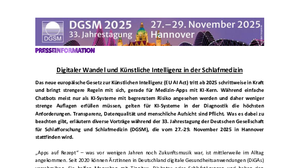 Das neue europäische Gesetz zur Künstlichen Intelligenz (EU AI Act) tritt ab 2025 schrittweise in Kraft und verändert in Europa die Spielregeln für KI. Wie das die Schlafmedizin betrifft, erfahren Sie in der folgenden Presseinformation.