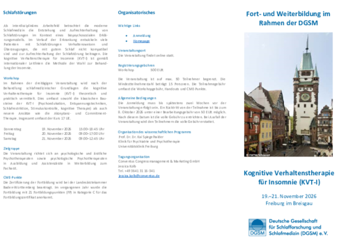 Im Rahmen der dreitägigen Veranstaltung wird nach der Behandlung schlafmedizinischer Grundlagen die kognitive Verhaltenstherapie für Insomnie (KVT-I) theoretisch und praktisch vermittelt. Dies umfasst sowohl die klassischen Bausteine der KVT-I (Psychoedukation, Entspannungstechniken, Schlafrestriktion, Stimuluskontrolle, kognitive Therapie) als auch neuere Ansätze wie die Akzeptanz- und Commitment-Therapie. Insgesamt umfasst der Kurs 17 UE.